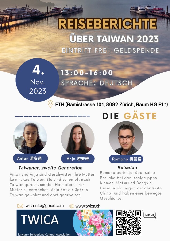 Gestern hat TWICA das Event “Reiseberichte über Taiwan” veranstaltet und es ist zum erfolgreichen Ende gekommen. Das ist der erste Versuch von TWICA, ein Forum für Förderung des Tourismus Taiwans auf Deutsch zu organisieren. Nachdem wir die aktive Teilnahme sowie das positive Feedback über das Essen von den Anwesenden wahrgenommen hatten, fiel uns ein Stein vom Herzen. Anton und Anja, die halb Schweizer, halb Taiwanese sind, haben ihre Reiseerfahrung in Taiwan erzählt. Das Publikum interessierte sich nicht nur für ihre Geschichte, sondern auch für ihren Migrationshintergrund. Romano hielt einen Vortrag mit Schwerpunkt auf Kinmen, Matsu und Dongyin. Es war für uns fabelhaft und gleichzeitig berührend, zu sehen, dass ein Schweizer die Reisetipps, Kultur und Geschichte Taiwans tiefgehend thematisiert.